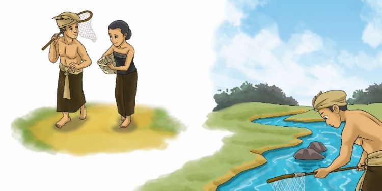 Pan Dalang memberitahu Men Dalang. “Tadi ketika menjaring ikan, Bli bertemu dengan penunggu ikan. Penunggu tersebut yang memberikan ikan ini.” Pan Dalang memberitahu istrinya sambil berseloroh. “Inilah penunggu ikan di sungai Yah Wos.”